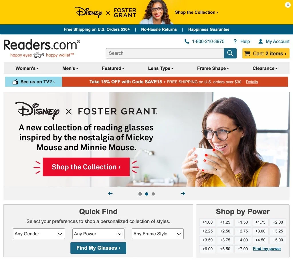 Designer for Disney x Foster Grant® line launch and campaign on Readers.com. Worked directly in partnership with creative director, copy writer, and photographer to create digital promotion for the launch of the eyewear collection pulling inspiration from the patterns and colors used on the products. My main focus was designing website assets and emails. Also, collaborated with our engineering team to activate new animation capabilities on site. You can see the collection here.